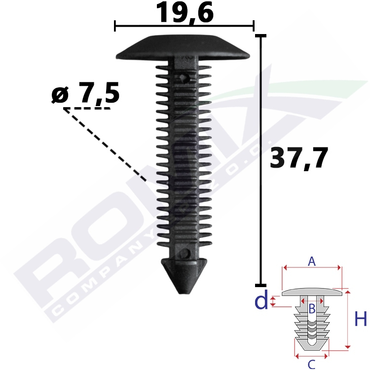 A 19,6 B 5,3 C 8,2 H 37,7 w otwór ø 7,5