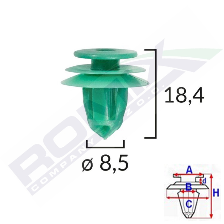 Wymiary: A 12,9 B 8,5 C 17,9 d 2,3 H 18,4 w otwór ø 8,5