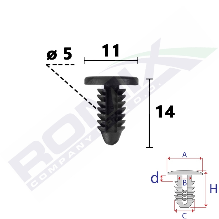 Wymiary: A 11 B 3,2 C 5,5 H 14 w otwór ø 5