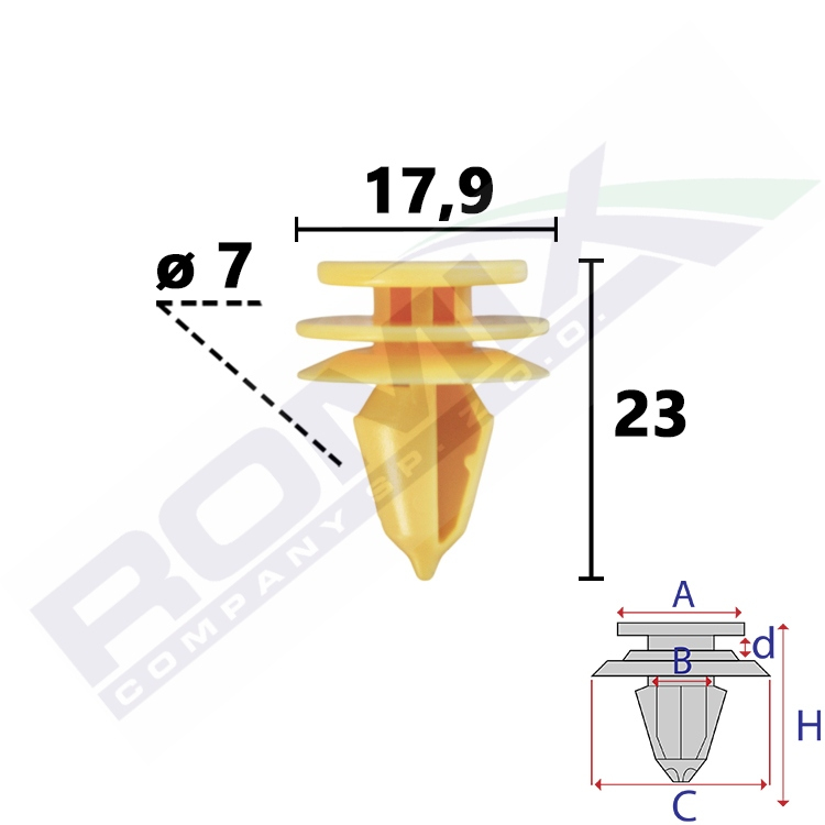 A 14,8 B 6,4 C 17,9 d 2,8 H 23 w otwór ø 7