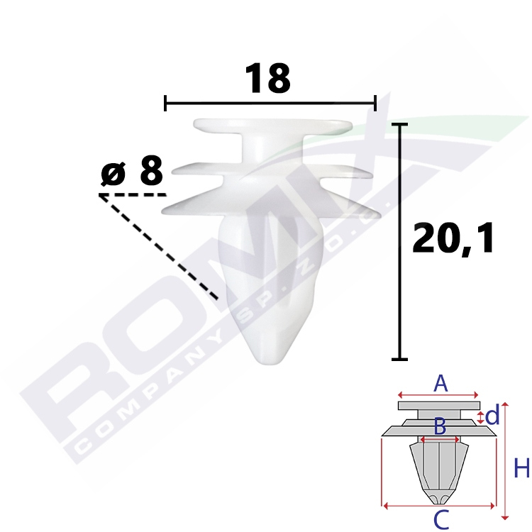 A 12,9 B 8,6 C 18 d 2,5 H 20,1 w otwór ø 8