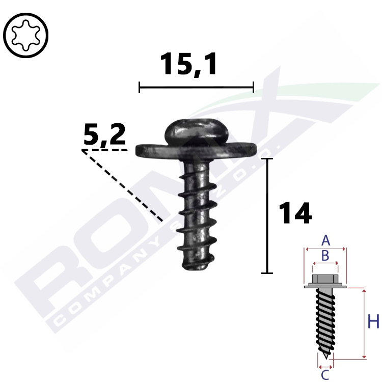 Wymiary: A 15,1 B 7,9 C 5,2 H 14